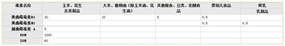 世界各国对食品中的真菌毒素的检测都很重视,随着人们对真菌毒素危害的认识,相关的限量标准不断的更新。我国在2005年公布了强制性粮食卫生标准(GB 2715-2005),首次增加了真菌毒素限量的标准,其中包括了四种真菌毒素(黄曲霉毒素B1、脱氧雪腐镰刀菌烯醇(DON)、玉米赤霉烯酮(ZON)和赭曲霉毒素A(OTA))。2011年,我国又颁布了最新的《食品安全国家标准 食品中真菌毒素限量》(GB/T 2761-2011),相比GB/T 2761-2005增加了赭曲霉毒素A、玉米赤霉烯酮的指标;修改了黄曲霉毒素B1、黄曲霉毒素M1、脱氧雪腐镰刀菌烯醇及展青霉素限量指标及检测方法。可见我国对真菌毒素在食品中的限量要求越来越高,限制的食品种类也越来越细。我国食品中真菌毒素的限量标准列于下表: