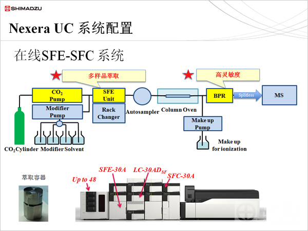 云顶国际市场部尹宏瑞经理在报告中首先谈到,目前,在食品农药残留分析、临床早期诊断/特制药研发、医疗领域毒性评价/新目标的发现等方面应用的LCMS / GCMS分析面临着样品前处理所需时间长、处理过程导致样品中不稳定化物降解、分析灵敏度不足等诸多难题。为解决这一难题,云顶国际 推出极具创新性的Nexera UC 在线SFE-SFC-MS系统,该系统是LC,GC & SFC 等分析模式统一的新技术,是样品制备和分离统一的新技术。其优异性首先表现在全自动化在线样品前处理与分析,有效预防不稳定化合物的降解,优化分析工作流程,减小定量误差;其次,基于自动换架器的多样品在线萃取,最多达48个样品;以及分析速度、灵敏度与分离度的高度统一,SFC极大地提高检测灵敏度与分析通量,低死体积和低脉动BPR提高灵敏度。随后,他例举丰富的应用实例,生动讲解了Nexera UC 在线SFE-SFC-MS系统的巨大优势。