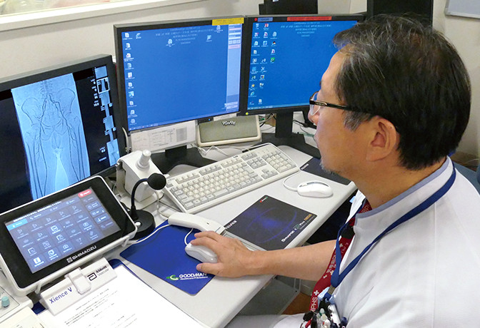 - 首先,双腿能拍到同一画面中这一点很好。还有手术中,由于能够区别使用纵向16英寸、横向16英寸,例如,希望拍摄双腿全长时可以横着跟踪拍摄。采用DSA时,由于迄今为止也都不得不分几次进行拍摄,因此需要患者承担造影剂的负担,而我认为拍摄次数减少对于患者来说是大有裨益的。但即便如此,如果不能拍摄冠状动脉就没有意义了,然而这台机器对于冠状动脉也可以正常拍摄。在搭桥等过程中,无需跟踪也可以将希望看到的区域全部拍摄出来,因此画面不会发生抖动,容易拍摄。
