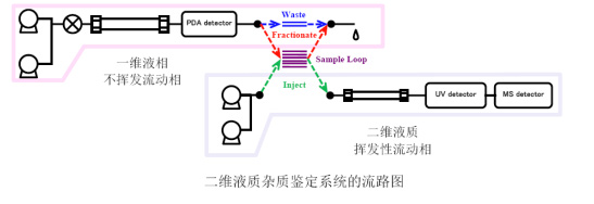 一般来说,制药企业质控部门的液相检测方法中会经常使用非挥发性缓冲盐流动相(如磷酸盐缓冲溶液)。但当进行液质联用分析时,流动相必须转换为适合于大气压下离子化方法的挥发性流动相。而改变流动相很多时候会使得杂质峰的保留时间发生变化,甚至湮没在主峰中,因此,需要耗时耗力摸索新的分析方法。通过使用这套系统,无需改变原先的流动相分离条件,就可以将目标杂质从一维色谱中收集下来,在二维色谱中直接使用挥发性流动相进行MS 分析。该系统可以有效地支持使用分子量进行的杂质鉴定工作。该系统的设计基于LCMS-IT-TOF 高端质谱同时兼容单四极杆和三重四极杆。